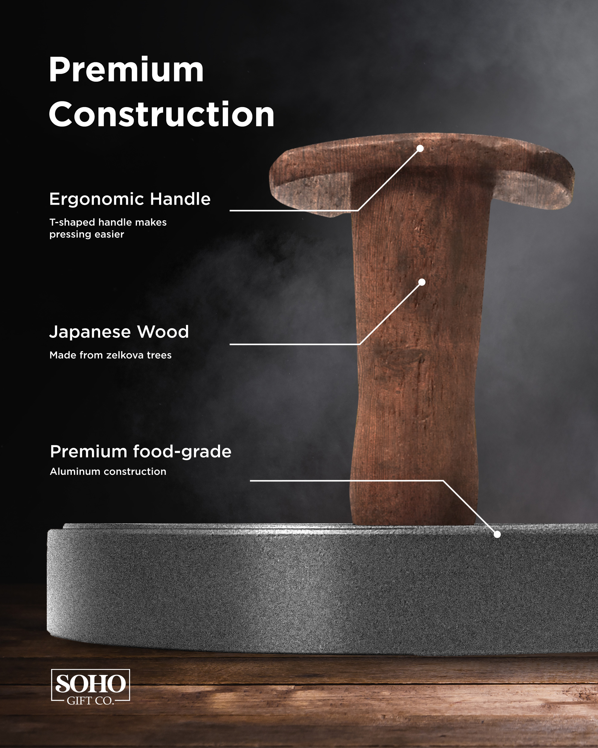 Made with an ergonomic wood handle and premium non-stick aluminum. (Diameter: 4.7" - Hand wash only)