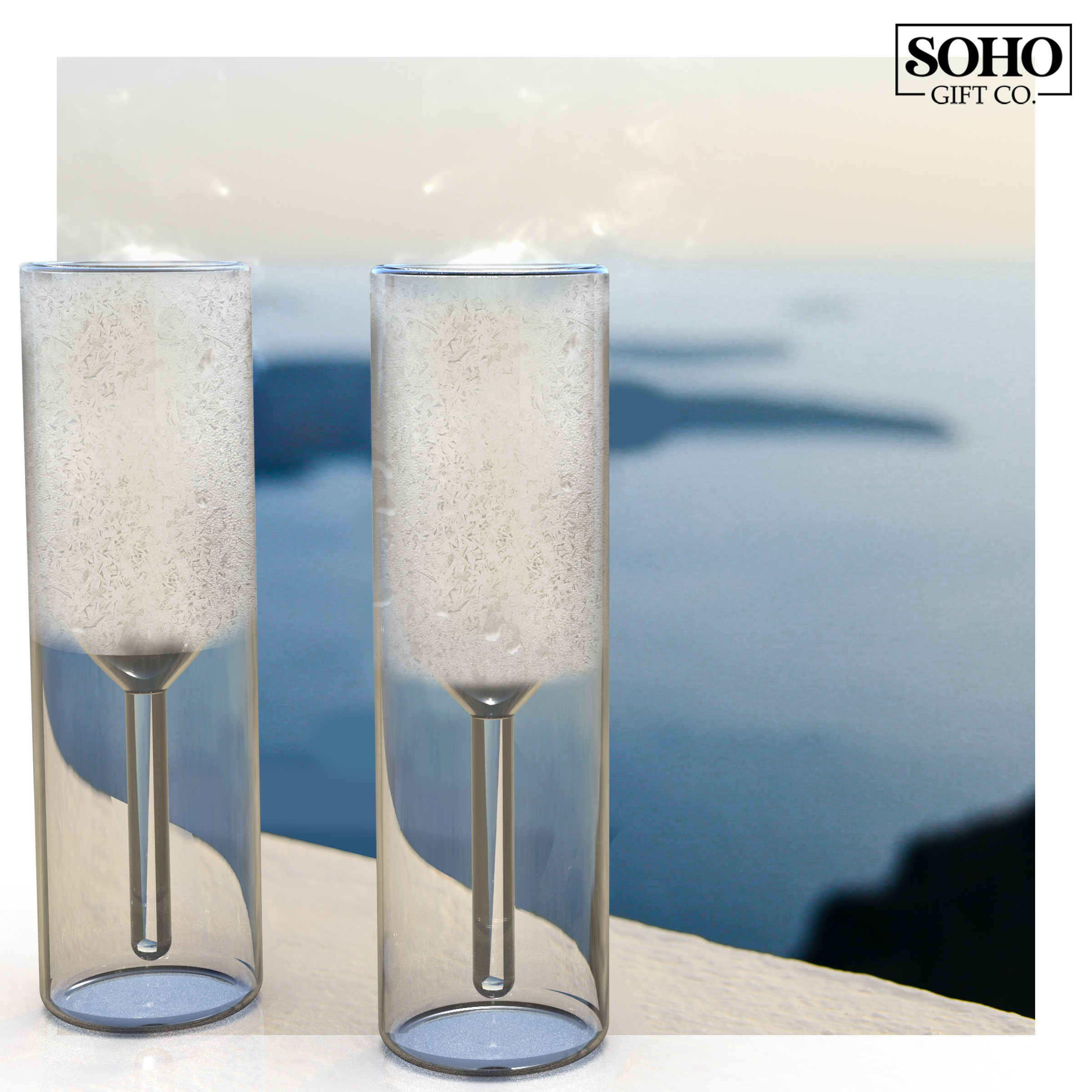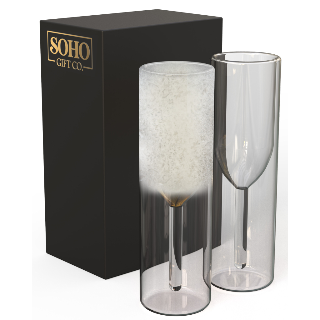 These double walled champagne glasses are made of ultra durable borosilicate glass with a 6.8-ounce capacity. (Dishwasher safe, not microwaveable)