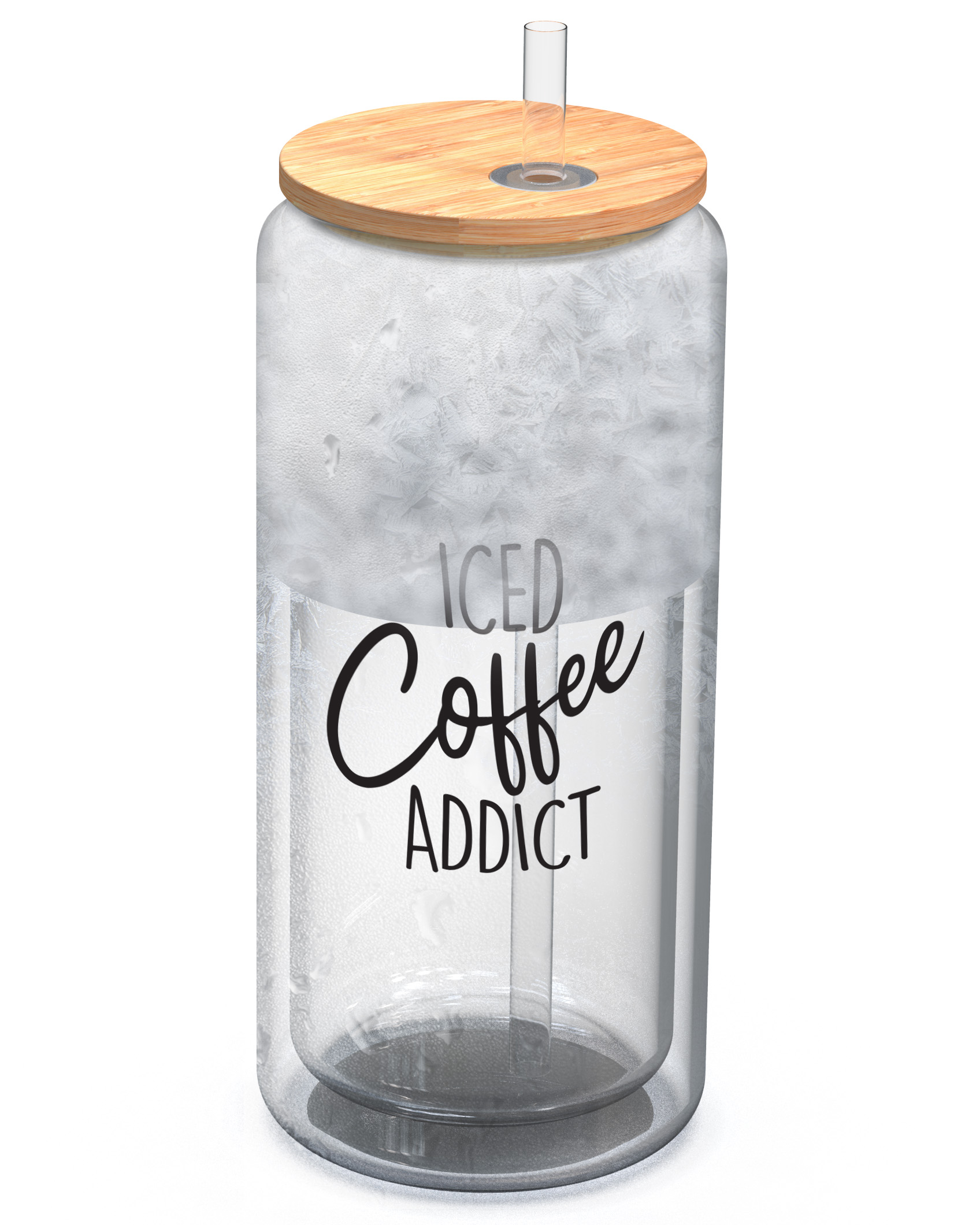 The double walled iced coffee cup is made of ultra durable borosilicate glass with a 15.2-ounce capacity, and includes a food-grade recyclable PETG straw and a bamboo lid. (Dishwasher safe, not microwaveable)