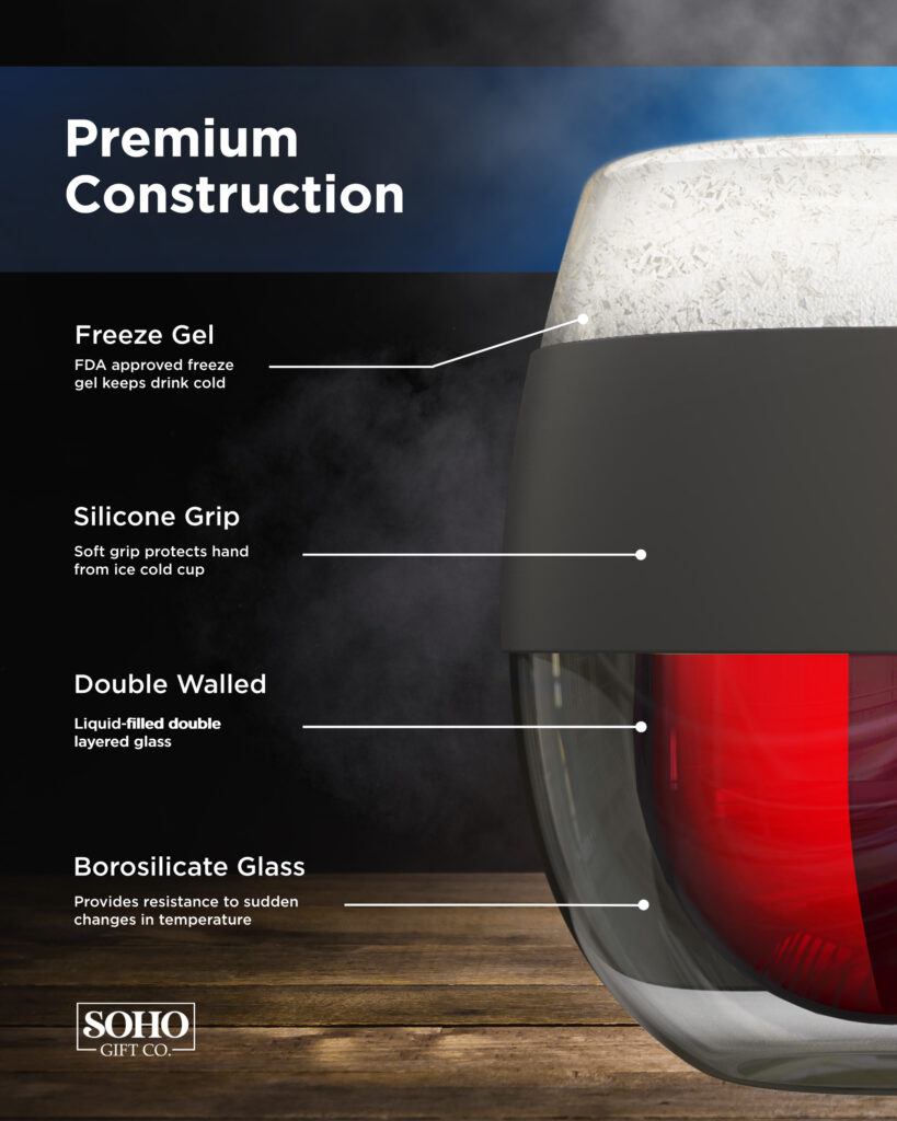 Double walled glass with built-in freezer gel chills her wine in seconds (Recommended freeze time: 3+ hours)