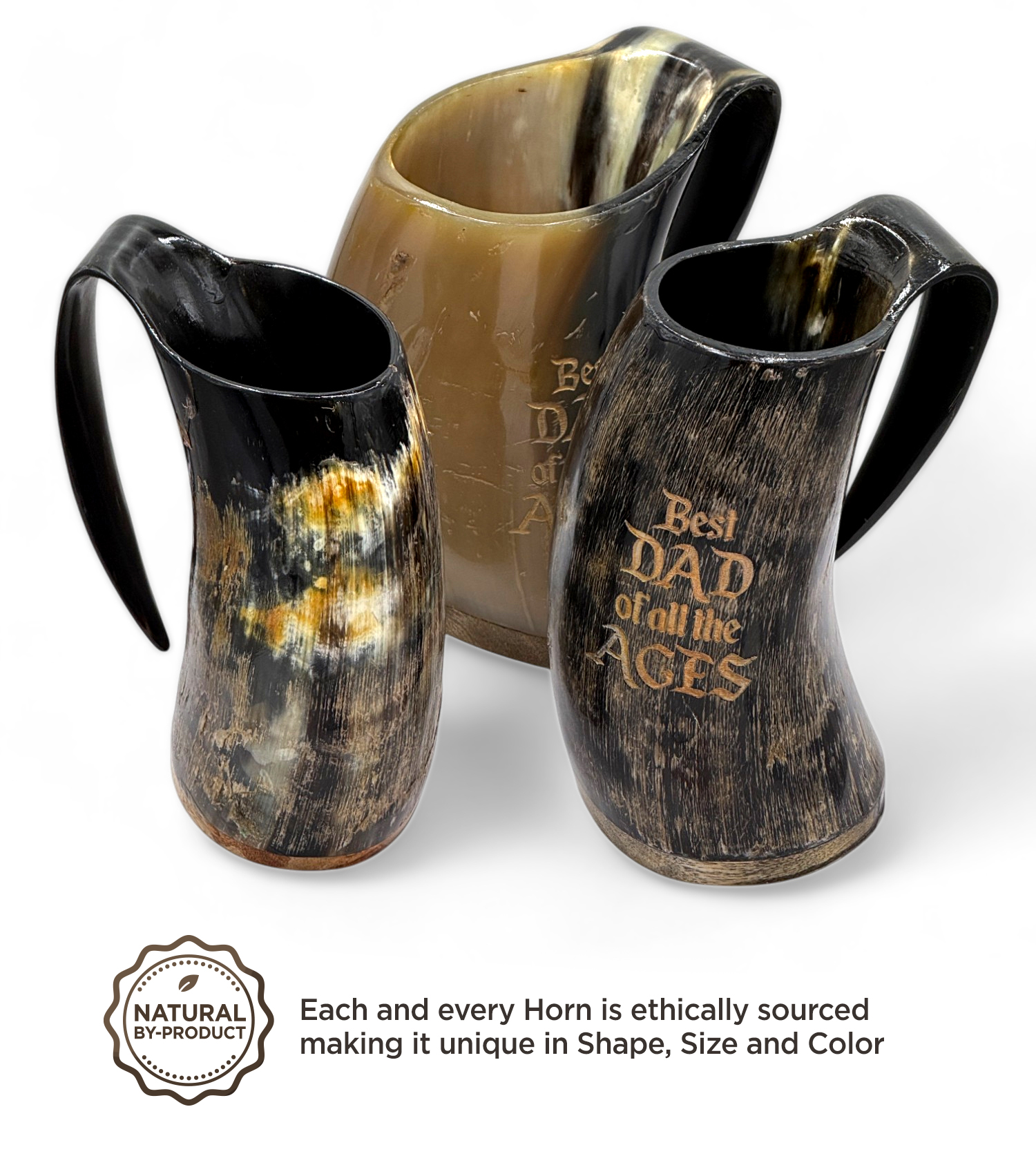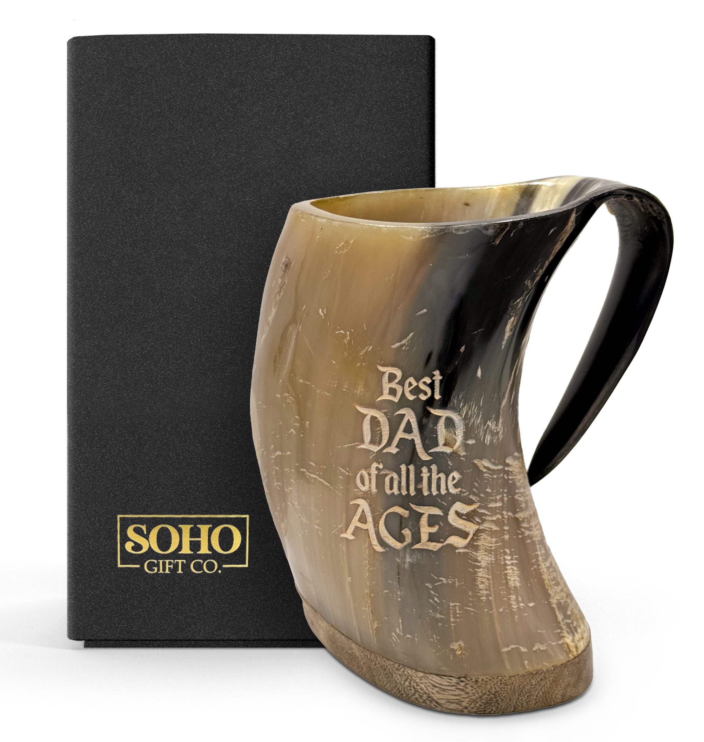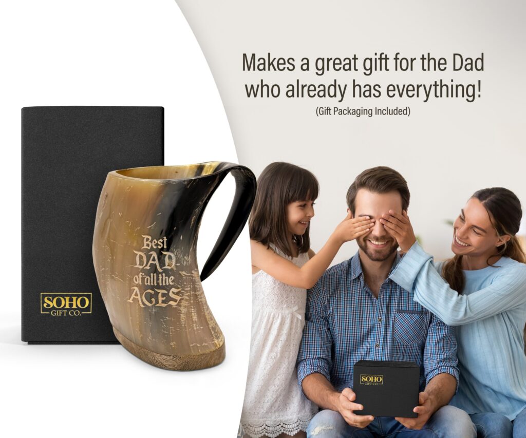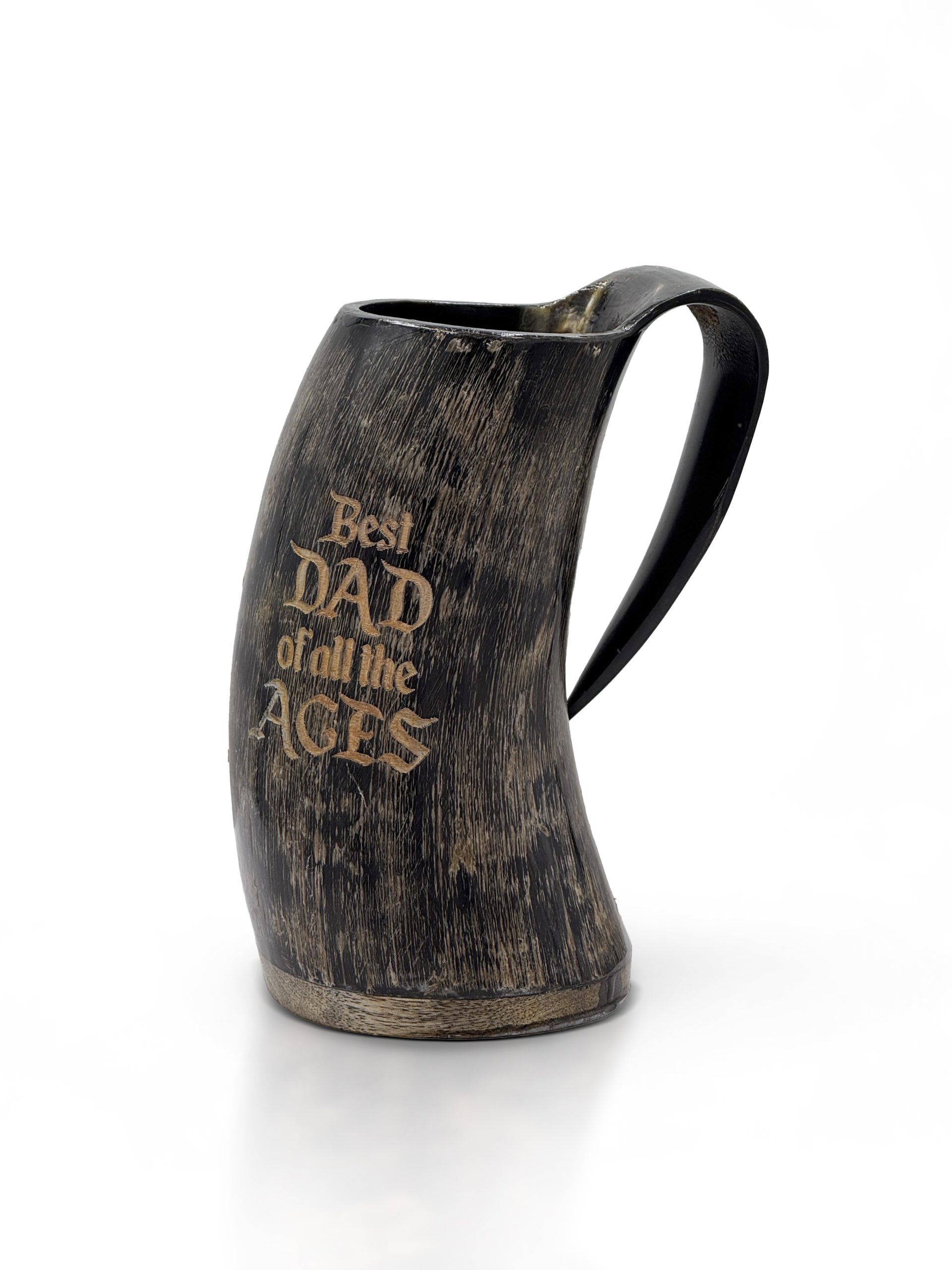 Give dad the gift of the authentic Viking experience with this unique horn mug. Engraved with "Best Dad of All the Ages," it's a gift that will make him feel like a true Norse warrior. This unique piece is more than just a drinking vessel; it's a striking medieval-inspired display piece. Crafted from genuine buffalo horn, each mug is a one-of-a-kind masterpiece, showcasing the natural beauty and variation of the material.